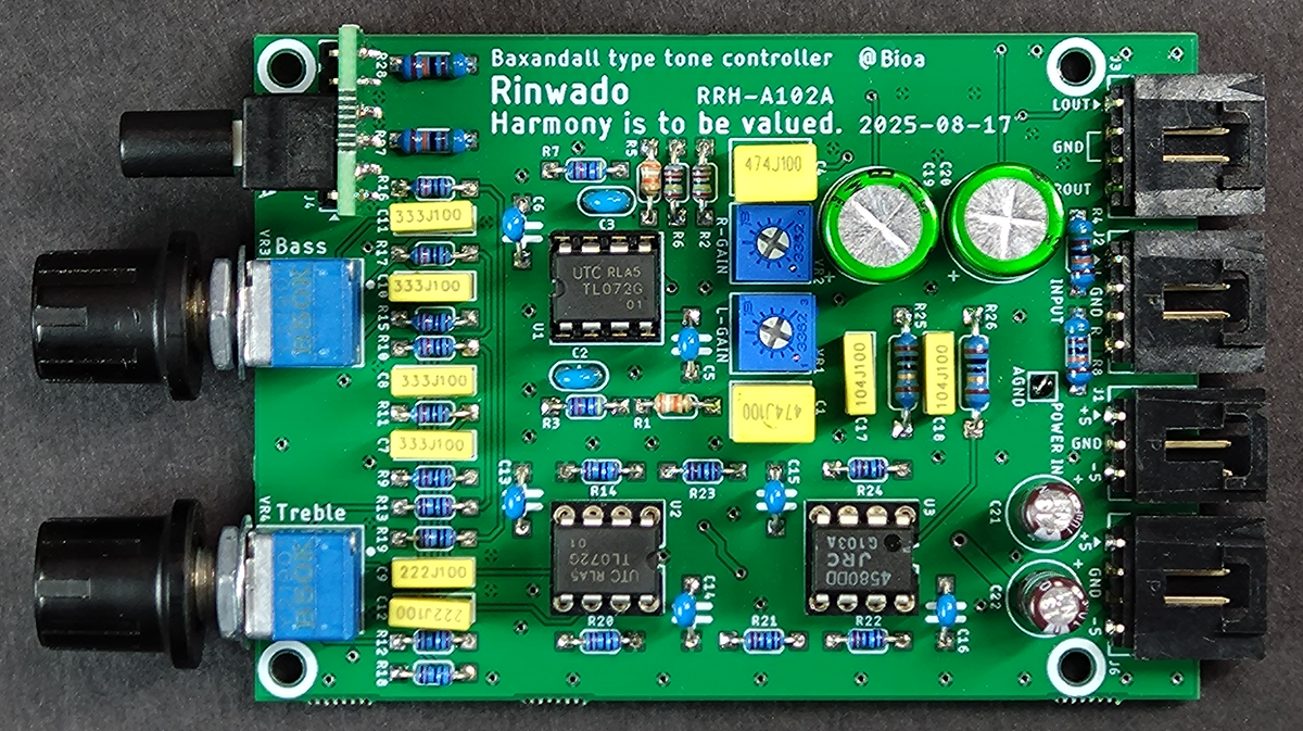 このボードは両電源が必要な、バクサンドール型のトーンコントロールボードです。入力段とトーンコントロール部には、JFET入力のオペアンプTL072を利用し、出力段には低雑音・低ひずみ・高出力電流なNJM4580DDを使用しており、ダイレクトにヘッドホンの接続も可能となっております。入力段では入力信号のレベルを微調整できるボリュームがあり、また入出力間をバイパスするプッシュスイッチも装備しています。