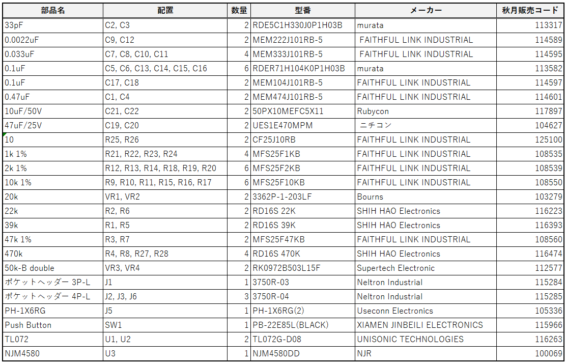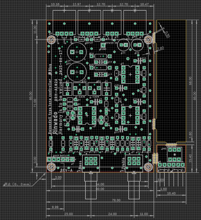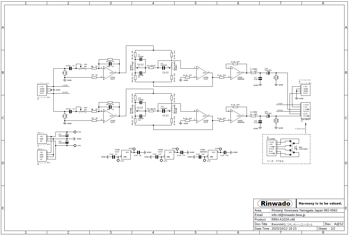 このボードは両電源が必要な、バクサンドール型のトーンコントロールボードです。入力段とトーンコントロール部には、JFET入力のオペアンプTL072を利用し、出力段には低雑音・低ひずみ・高出力電流なNJM4580DDを使用しており、ダイレクトにヘッドホンの接続も可能となっております。入力段では入力信号のレベルを微調整できるボリュームがあり、また入出力間をバイパスするプッシュスイッチも装備しています。